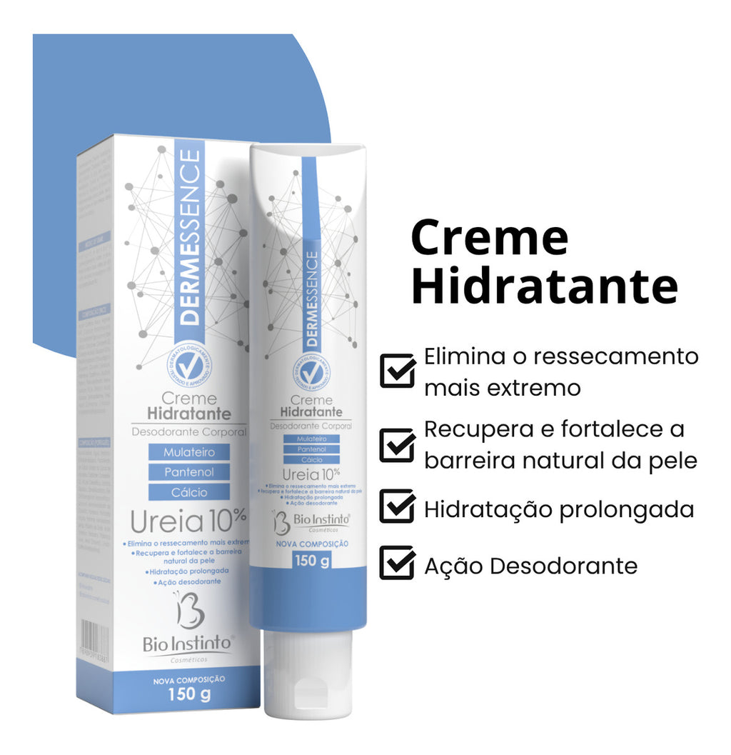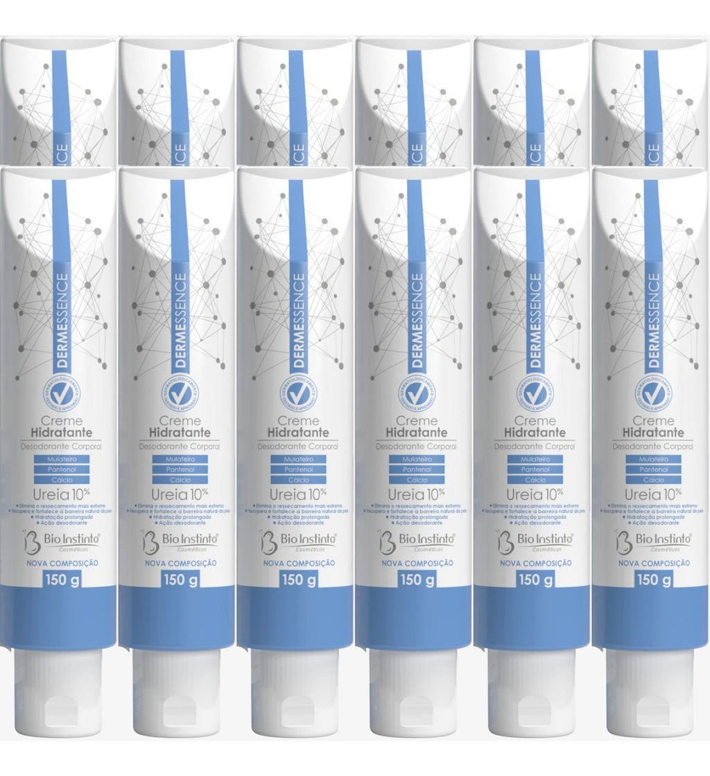 Bio Instinto Dermessence - Creme Desodorante e Hidratante Corporal Ureia Demessence Creme Hidratante Desodorante Corporal Uréia 10% Bio Instinto é rico em cálcio, mulateiro, ureia e pantenol. Fórmula especialmente desenvolvida para pele seca, toque suave e não oleoso. Ideal para o uso diário. Benefícios - Elimina o ressecamento mais extremo; - Recupera e fortalece a barreira natural da pele; - Hidratação prolongada; - Ação desodorante. Modo de Uso Aplique o produto generosamente sobre a pele limpa e seca duas vezes ao dia com suaves massagens até completa absorção.